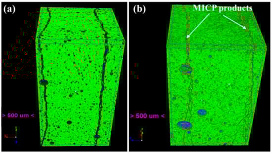 Figure 8 presents the 3D view of samples after bio-liquid spraying, in which the MICP products distributed along the depth of cracks could be observed. It is noted that the top surface of the sample that is shown in Figure 8 is the surface that was in contact with the bio-liquid. Every raw image obtained from the CT scan presented a 2D array of contiguous squares consisting of 256 possible levels (i.e., 0–255 pixels) of gray intensity [39]. The variations in the gray levels referred to different materials and were allocated as: (i) 0–30: Cracks and pores, (ii) 31–100: Healing products, and (iii) 101–255: Cement matrix [39]. As illustrated in Figure 8, in the case M (Figure 8b), MICP products not only appear near the top surface in the crack but also throughout the crack depth. However, there are no MICP products observable within crack space in case W (Figure 8a).