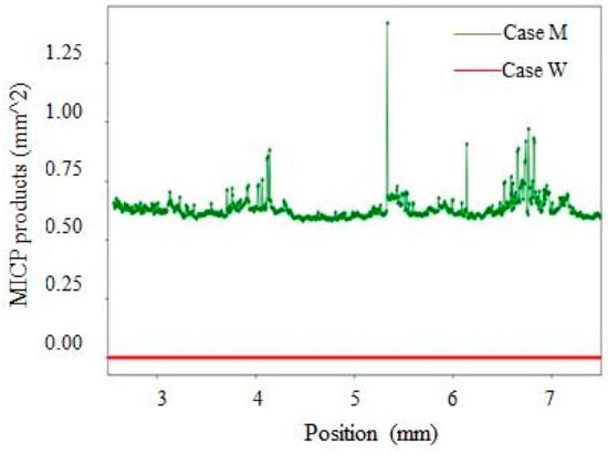 Figure 9 shows the amount of MICP precipitates as a function of crack depth. It can be seen that in case M, the MICP products distributed not only near the surface of the sample but also deep inside the crack up to 7 mm depth. In contrast, the amount of MICP products at different crack depths is zero for case W. This observation further demonstrates much higher crack repair efficiency when using mutant bacteria strains.