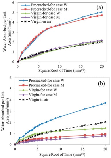 Figure 10 displays the water absorbed per unit area on samples over time. From Figure 10a, it can be found that, due to the presence of cracks, pre-cracked specimens absorbed much more water as compared with that of virgin ones. That’s because the cracks acted as a capillary pipe to absorb and store water within crack space. For pre-cracked specimens, before repair agent spraying, the water absorptions for both series are nearly indistinguishable (see the blue and red line), which is expected as these two specimens have the same crack pattern (the same specimen was cut in two halves in the direction perpendicular to the cracks). Compared with the virgin samples, the extra water absorbed in pre-cracked samples was mostly contributed by the cracks. Therefore after bio-liquid spraying, the change in water absorption or sorptivity between the pre-cracked and virgin samples can be used to evaluate the sealing efficiency.