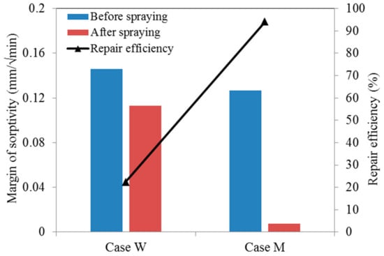 Figure 12 displays the margin of sorptivity of pre-cracked specimens, which is defined as the difference in sorptivity of specimens before and after bio-liquid sprayings. It can be seen that, after spraying, the margin of sorptivity of the pre-cracked specimens for series M decreased very distinctly, while only a slight reduction achieved for series W. The decrease percentage for the series W and M, which reflect the repair efficiency, is 22.4% and 94.1%, respectively. This observation again demonstrated that the cracks in concrete could be sealed very effectively by spraying the genetic modified bacteria liquid.