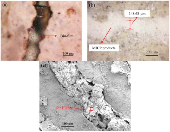 Observations of products within crack space (a) bio-film formation after wild type bacteria spraying under an optical microscope; (b) MICP products after mutant type bacteria spraying under n aoptical microscope; (c) SEM image of sealing products within the crack.