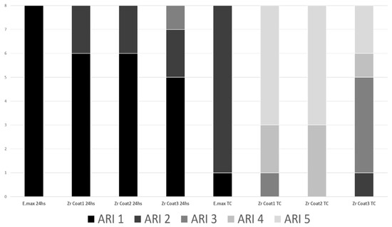 Figure 1 presents the failure pattern according to the ARI criteria (Table 3). The E.max control subgroup had all samples fractured at an ARI classification of 1, characterized as when the resin cement detached from the orthodontic tube inner surface. After thermocycling, the E.max subgroup was the only one to show some ARI 1; most of the rest of the specimens were ARI 2. Only zirconia treated with the ceramic primer and subjected to artificial aging by the thermocycling method showed ARI 5 and 4 classification.