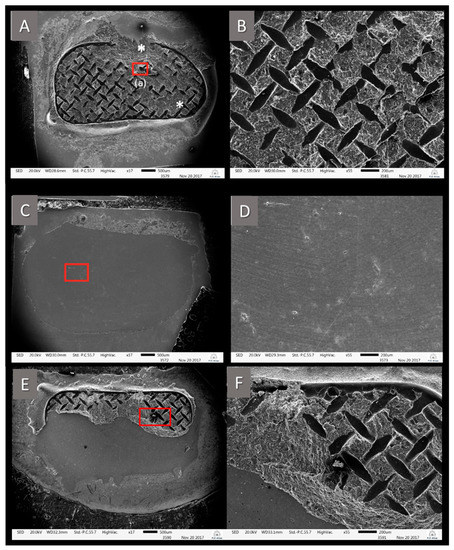 SEM images showing different failure patterns. (A) (17× magnification) shows almost the entire interior design of the orthodontic tube used. The structure of the resinous material remained almost entirely on the ceramic, except for the region marked with *. (B) (55× of magnification) represents the region marked by the red square at (A). This fracture is classified as ARI 1, 100% of the resin attached to the zirconia. (C) (17× of magnification) is representative of the ARI 5 (no resin over the zirconia). In its high magnification (D) (55× of magnification) of the region marked with the red square, zirconia is free of resinous material. (E) (17× of magnification) represents the fracture pattern ARI 3, 10%–89% of the resin material attached to the ceramic. The image shows a mixed failure mode, as there was a displacement of the resinous material from the orthodontic tube, cohesive fracture of this same resinous material which is visualized in image (F), (55× magnification), and there is ceramic free of any resinous remnant.