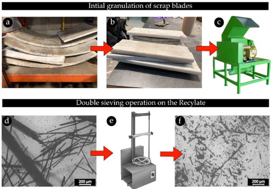 Figure 1 shows the recycling scheme, which is used to extract the glass fibers from wind turbine blades. Mechanical grinding of the end of life turbine blades is used to extract the reinforcement fibers from the blades. In this process, the scrap blades are first cut into 20 × 20 cm pieces and fed into a hammer mill grinder (ECO-WOLF, INC., Edgewater, FL, USA) equipped with a 3 mm classifier screen. As can be observed in Figure 1b, only sections made of pure fiberglass composites are used in this study. As a result, the recyclate compound obtained after the grinding process is not isolated glass fibers, rather a mixture of glass fibers and particles of resin.