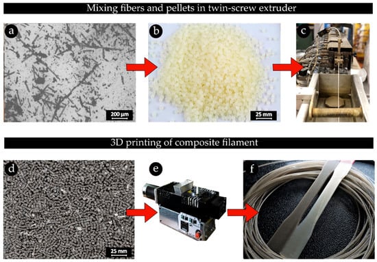 The double extrusion process to obtain 3D printing composite filament: (a) the last grade of the recyclate; (b) PLA pellets; (c) palettization process with a twin-screw extruder; (d) the glass fiber reinforced pellets; (e) single screw filament extruder; (f) the recycled glass fiber reinforced filaments and composite tensile test specimens.