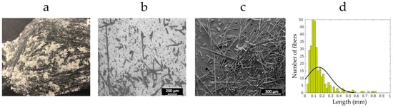 Recycled fibers: (a) the final grade recyclate; (b) an optical microscopy image from the recycled compound; (c) a SEM micrograph from the recycled compound; and (d) probability distribution for fiber length of the last grade of ground fibers.