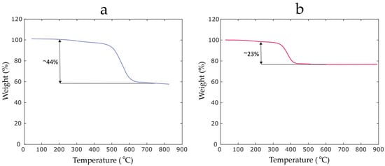 The thermogravimetry thermograms of the recyclate materials: (a) ground recyclate; (b) last grade of the recyclate obtained after the second sieve operation.