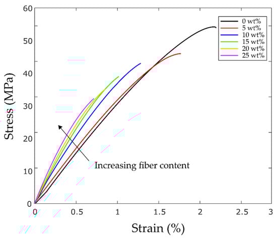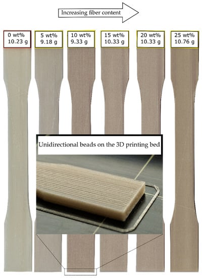 Figure 7 shows one 3D printed specimen per each fiber content. The unidirectional bead orientation can be seen in all samples. A comparison of the typical stress vs. strain curves of the specimens is shown in Figure 8. The curves are selected from the results of seven specimens.