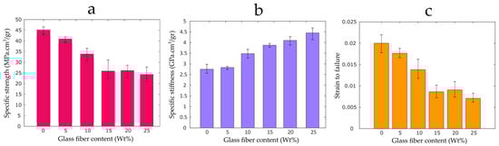 Tensile properties of glass fiber reinforced specimens with different fiber content: (a) specific stiffness; (b) specific strength; and (c) failure strain.