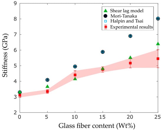 Different established analytical models including Mori–Tanaka, shear lag, and Halpin–Tsai are used to predict and compare the elastic stiffness of short glass fiber composites to that of the 3D printed parts [37,38]. The theories are briefly described in Table 3. In these equations, , , , and denote the fiber stiffness, matrix stiffness, fiber volume fraction, and fiber aspect ratio, respectively. In addition, S, , and represent the Eshebly tensor, and stiffness tensor of the composite, matrix, and fiber, respectively. As displayed in Figure 10, the theoretical models showed a similar trend as the experimental results and they agree well, particularly at low weight fractions. However, the high viscosity of the polymer at high weight fractions coupled with nozzle clogging increased the porosity of the 3D printed parts leading to larger difference between the experimental results and the analytical models.