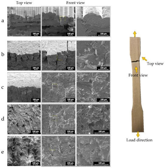 To further investigate the reasons behind the mechanical behavior of the composite 3D printed specimens, their microstructure at the fracture surface is studied. Figure 11 shows the scanning electron micrographs of representative samples from the top and front views. As can be seen, the addition of the recycled fibers substantially reduced the surface quality of the coupons. It was observed that the surface quality of the coupons is consistent with the fiber content. The lower the fiber content, the better surface quality. As the fiber content of the filament increases, the distribution of the fibers within the beads aggravates such that some of the fibers are not deposited properly and are not embedded within PLA. This phenomenon generates local stress concentration regions, which could be one reason for the low strength of the composite samples. Another cause for the lower strength of the composite samples could be the presence of resin particles and fibers with ineffective length in the critical zones, which boost the possibility of microcrack formation. The nonuniform distribution of resin particles on the surface of fibers, particularly at fiber ends, could be another culprit for the reduction in ultimate strength of the composite samples. Moreover, the composite samples with higher fiber content contained a higher quantity of pores. This observation could be ascribed to the presence of large pores in the composite filaments and also the incidence of nozzle clogging when printing with higher fiber content filaments. Previous works showed a similarity in the strength and stiffness trend for 3D printed composite parts [39,40]. For example, in a recent study on hemp hurd/PLA filament, while an increase in the volume fraction of the fiber improved the part stiffness, it was associated with a larger quantity of voids, which led to lower tensile and flexural strength for the 3D printed samples [41]. In another study, 3D printed graphene-based ABS parts featured lower tensile strength and ductility as compared to virgin ABS samples [42]. Two main possible reasons for this property degradation were identified as high viscosity of the polymer, as well as the local stress concentration induced by graphene nanoplates. This observation confirms the stress raiser effect of the epoxy particles dispersed in the recycled glass fiber composite parts.