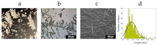 Virgin fibers: (a) the reinforcement fiber compound; (b) an optical microscopy image from the virgin fibers; (c) a SEM micrograph from the virgin fibers; and (d) probability distribution for the fiber length of the virgin fibers.