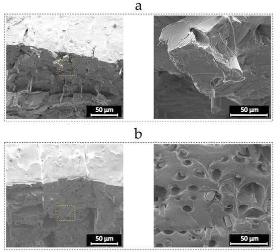 As shown in Figure 14, the SEM images from the fracture surface of the samples with virgin and recycled fibers reveal a better impregnation of the recycled fibers and PLA as compared to virgin glass fibers. Although pulled out fibers can be detected on the fracture surface of the recycled samples, most of the recycled fibers are broken and embedded within PLA. On the other hand, many holes on the fracture surface of the specimen reinforced with virgin fibers appear, which show fully pulled out fibers. The presence of epoxy residues on the surface of fibers can contribute to the interfacial strength by providing the possibility of mechanical and chemical interactions between PLA and fibers, where the former results from fiber surface roughness and the latter arises from hydrogen bonding [36]. This indicates an excellent opportunity to fabricate structurally stiff and light weight components with the use of ground fibers from scrap rotor blades.