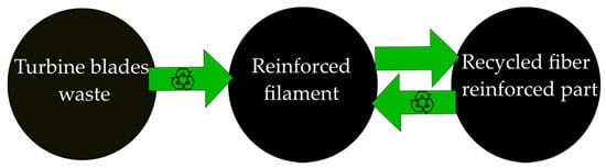 The main contribution of this work relies on a sustainable cost-effective way using an efficient grinder to convert the processed fiberglass into manageable short fibers. This approach will avoid the need for high-energy conversion processes, such as pyrolysis, for recycling. A recent study on the recycling of wind turbine blades has highlighted that the primary energy requirement for mechanical, thermal, and chemical recycling of glass fiber thermoplastic reinforced blades are, respectively, 0.29 MJ/Kg, 1 MJ/Kg, and 4 MJ/Kg, values which indicate the high efficiency of the grinding process for glass fiber composites [3]. One major obstacle hindering the use of mechanical recycling is the loss of high aspect ratio fibers. That being said, the results of this investigation have shown that short fiberglass-reinforced polymers can lead to stiffer 3D printed components with added value for the end users. Using a sustainable and biodegradable polymer, the proposed process will be sustainable since the 3D printed parts made by fiberglass reinforced polymer filaments could also be reused and re-cycled back into the same system, making the entire process waste free, as shown in Figure 15. One critical factor contributing to the applicability of the proposed recycling scheme is the length of the fibers in the recycled compound. Weight statistics investigation shows that approximately 55–60% of the ground recyclate comes out of the sieve after the second sieve operation and the remaining recycled material is not processable. However, the non-sieved residue could be either further ground and reused in the same recycling system or processed using 3D printers with larger nozzle diameters.