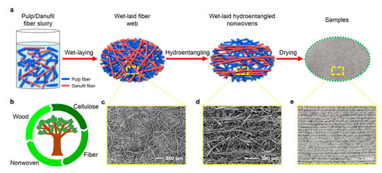 (a) Schematic illustration of the fabrication of wet-laid hydroentangled nonwovens; (b) biodegradability and environmental prospects of materials; SEM photographs show the micro structures of (c) wet-laid fiber webs and (d) wet-laid hydroentangled nonwovens; (e) optical photograph shows the structure of samples.
