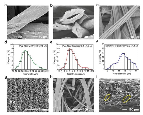 Parameters of raw fiber materials were measured from SEM images by using Adobe Acrobat. The width and thickness of pulp fibers and the diameter of Danufil fibers were calculated and expressed as the average ± standard deviation. At least 100 measurements were taken for each sample.