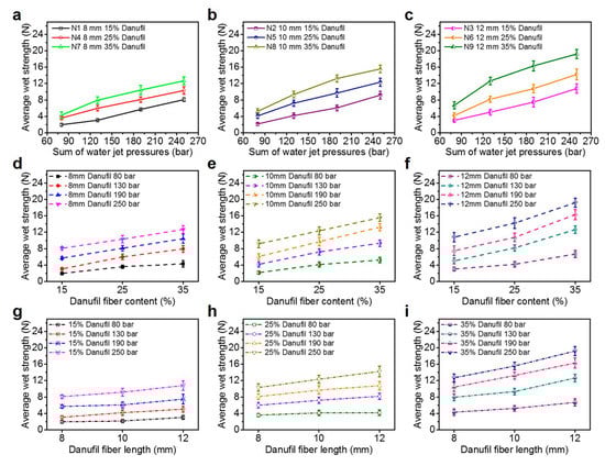 Average wet-strength. (a–c) Effect of water jet pressure; (d–f) effect of Danufil fiber content; (g–i) effect of Danufil fiber length.
