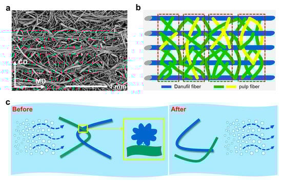 (a) Surface SEM image and (b) structural schematic of wet-laid hydroentangled nonwovens (N8); (c) schematic representation of water flow disentangling the fiber entanglement.