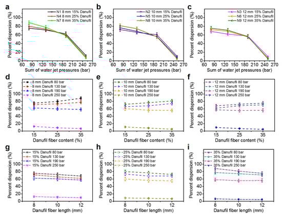 Percent dispersion. (a–c) Effect of water jet pressure; (d–f) effect of Danufil fiber content; (g–i) effect of Danufil fiber length.