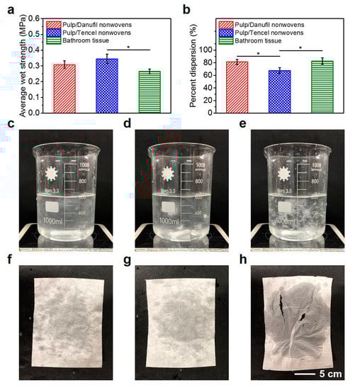 Comparisons of pulp/Danufil wet-laid hydroentangled nonwovens, pulp/Tencel wet-laid hydroentangled nonwovens, and bathroom tissue. (a) Average wet strength; (b) percent dispersion; (c–e) dispersion effect; (f–h) samples after wiping wet hands.