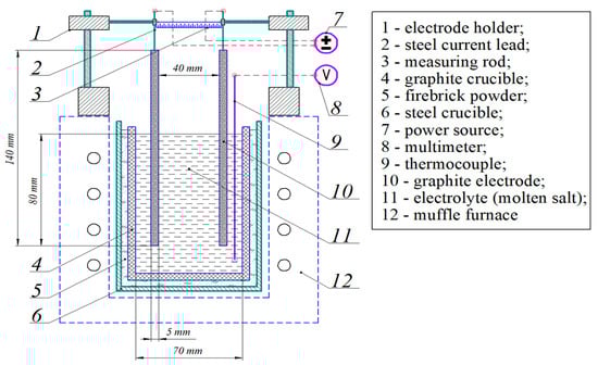 An electrochemical cell was developed in order to determine the dissolution rate of Al2O3 in Na3AlF6. The scheme of this cell is shown in Figure 2. The graphite crucible was chosen as the basis for the electrochemical cell due to the stability in the aggressive molten cryolite salts [24,25,26]. The graphite crucible was enclosed in a steel casing and alumina backfill was located in the space between the crucible and casing. Graphite rods (0.5 cm × 14 cm) were used as electrodes. The measuring rod was installed in order to adjust the interelectrode distance between the electrode holders. The melt temperature was controlled by a platinum–platinum rhodium thermocouple. The GW PSW7 30-72 power source (GW instek, Taiwan) was used as a direct current (DC) power supply. The cell was heated using the KC 2/15 muffle furnace (Nabertherm GmbH, Lilienthal, Germany).