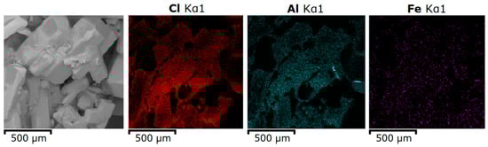 According to the results of the thermal analysis of AlCl3·6H2O (see Figure 5), studies on the calcination of aluminum chloride hexahydrate crystals were carried out. The studies were conducted at three different calcination temperatures for 90 min each. The chemical compositions of alumina obtained by calcination are presented in Table 5.