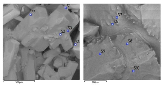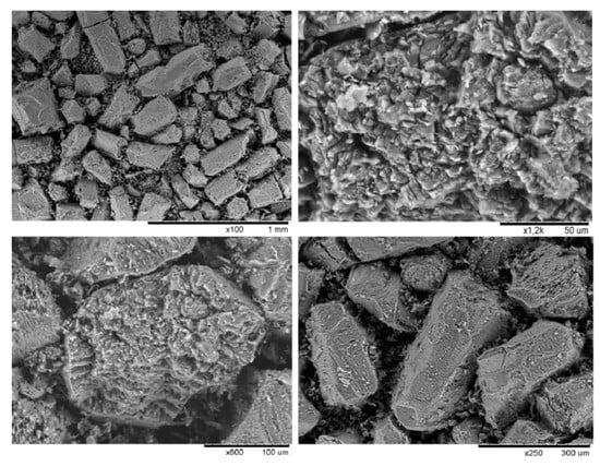 Figure 9 shows SEM images of alumina obtained by hydrochloric acid technology. The samples were obtained by the calcination of aluminum chloride hexahydrate at 900 °C. As can be seen on the figure, the surface of alumina obtained from ACH was covered by the net of thin cracks emerging from the grain body. These cracks promote the removal process of hydrogen chloride and water vapor. At the same time, crack development was observed in certain directions according to the structural anisotropy of the AlCl3·6H2O crystal, without significant destruction of the ACH particle’s original shape. The destruction of ACH particles during calcination occurred mainly due to the destruction of agglomerates consisting of a large number of fine fractions. In addition, the developed porous surface of alumina obtained from ACH had a high active surface and promoted adsorption of fluorine-containing waste gases of aluminum electrolysis and increased the rate of alumina dissolution in the electrolyte.