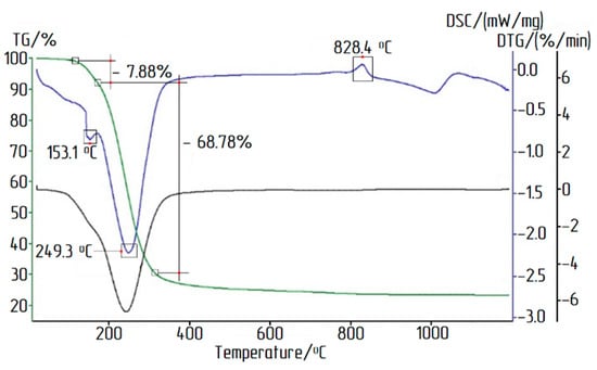 To determine the temperatures of dehydration, water and chlorine removal, as well as phase transitions, the obtained samples of ACH were subjected to thermal analysis (see Figure 5 and Figure 6). The measurements were performed on the initial ACH under dynamic heating of the sample up to 1200 °C at a rate of 10 degrees per minute in an argon atmosphere.