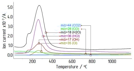 ACH synchronous thermal analysis: mass spectral ion current versus temperature.