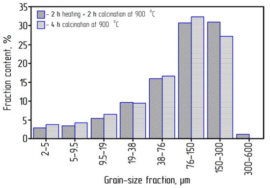 The average size of alumina particles obtained at both temperature modes of calcination was 150 microns. Thus, the particle size decreased by more than three times during ACH calcination, which can be explained both by the destruction of agglomerates of the initial ACH and primary crystals. According to Figure 8, when the ACH was placed in a hot furnace, there was a slight over-grinding of the material compared to the smooth heating. This was due to the more intense release of the gas phase from the ACH.