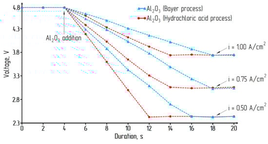 The achievement of a constant voltage on the electrochemical cell using alumina produced by acid technology occurred on average 4 s faster, which indicates a better solubility of the alumina in cryolite.