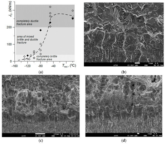In order to establish the characteristic mechanisms of subcritical crack development, tests on the SENB specimens (B = 12.0; W = 24; S = 96 mm; a0/W = 0.5) were carried out in temperatures ranging from −120 to 20 °C. The dependence of the J-integral (JIC or JC) critical values on temperature was obtained, as shown in Figure 2a. There were three characteristic intervals in the temperature dependence of the critical values of fracture toughness: (i) the area of the low plateau, for T ≤ −100 °C, where a completely brittle fracture by cleavage of the subcritical crack was observed (Figure 2b); (ii) the zone of mixed fracture, −100 °C < T < −50 °C, where the crack grew by both brittle-cleavage and ductile mechanisms, with the latter being through the development of voids (Figure 2c); and (iii) the area of the upper plateau, T ≥ −50 °C, where crack growth was completely ductile (Figure 2d). As the temperature increases, the plasticity of the material increases. An increase in the participation of ductile growth mechanisms during propagation of the subcritical crack and an increase in the critical value of JIC, as well as the stretch zone width (SZW).