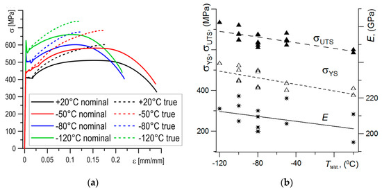 Uniaxial tensile tests results. (a) The nominal and true stress–strain dependences for different temperature and (b) change of strength properties with temperature.