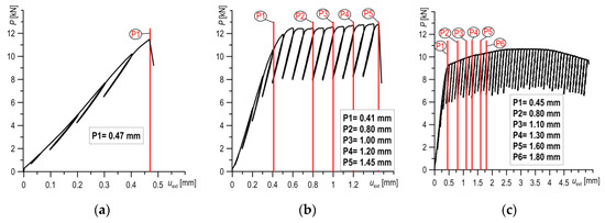 For the numerical calculations, load was introduced by forcing the displacement (from pressure) of the upper roll on the surface of the SENB specimen. Numerical simulations of loading were carried out according to the true load recorded during the experimental tests. Numerical calculations were made for different load stages (Pi), wherein the results obtained from the extensometer indicated characteristic fracture types: brittle, brittle-ductile and ductile (Figure 5).