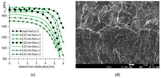 The stress σ22 distributions in parallel to the middle layers, from central to lateral planes, are presented in Figure 6b. The change of stresses σ22 in the thickness direction at some distance from the crack tip are shown in Figure 6c. Based on the data presented in Figure 6b,c, one can see that the stresses σ22 possess high values at a certain width and distance from the crack tip, but fall as they move away from the front of the crack, decreasing quickly at the lateral planes of the specimen.