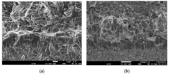 Brittle cleavage fracture occurred (Figure 2b) in the ferritic steel specimens at temperatures corresponding to the lower plateau of the brittle-to-ductile transition dependence. This type of fracture usually takes place in negative temperature conditions, below −80 °C. However, in some heat-resistant ferritic steels operated for a long time in high temperatures (e.g., 14MoV6-3, 14MoV6-9, DIN Standard), an increase in the service time of the elements can result in a significant shift. In such steels, brittle fractures may be observed at higher temperatures, even above 0 °C [48].