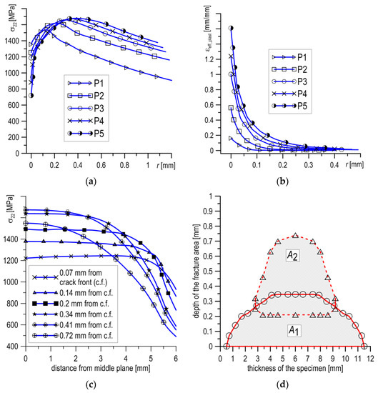 According to the stress distributions in the specimen thickness direction at the moment of loading P5, shown in Figure 8c, the area of stresses σ22 ≥ σC = 1550 MPa were located in zone A2, shown in Figure 8d. In the case of mixed cleavage and ductile fractures, the position and shape of the zone σ22 ≥ σC was significantly different from the one observed for completely brittle fractures (Figure 8d). The zone in this case was offset from the crack tip about 210 µm and it was longer (≈550 µm), although its width was smaller (≈6.4 mm). Despite this, the areas of the zones in both cases were similar: A1 ≈ 2.88 mm2 and A2 ≈ 2.76 mm2, and thus the lesser of these values can be accepted as a critical size, AC.
