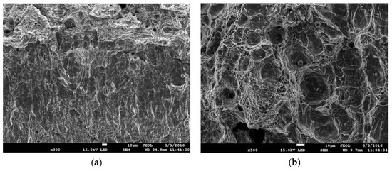 However, research shows that the relationship in Equation (5) describes the process of a void’s growth in certain ranges of εeff_plast and η. The development of a ductile fracture through nucleation, growth and joining of voids is possible when εeff_plast > 0.4, and the factor η is in the range of 0.7–1.0 (Table 2). When the SENB specimens were tested, this area was able to occur immediately before the top of the pre-crack. Similar ranges for sizes εeff_plast and η during ductile crack growth have also been obtained on specimens with other shapes [39,40].