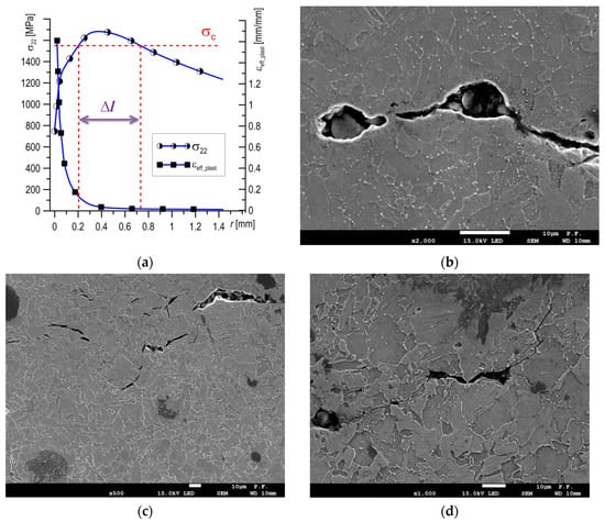 For the fully ductile mechanism of crack growth, the stress and strain distributions are presented in Figure 11a. The ductile mechanism is characteristic for cracking in the upper plateau, which for S355 steel is at T ≥ −50 °C. The stresses σ22 were found to be lower everywhere then the critical value of σC (Figure 11a); thus, brittle fracturing by cleavage could not occur. On the other hand, the strains εeff_plast immediately before crack the tip (in the section 0 to 0.2 mm away) reached high values, from 20% to 160%. SEM observations showed that for test temperatures T ≥ −50 °C, the length of the section on which the formation of voids takes place was similar, about ≈100 µm. Along this section, the level of plastic strain varies from 50% to 150%. Large voids developed and grew around particles of non-metallic inclusions, joining up with the main crack before the front of the crack tip (up to 25–30 µm), where the level of strain was 100%–160%, (Figure 11b). However, at a distance 30–100 µm from the crack tip, isolated large voids around non-metallic inclusions and minor voids around particles of carbide precipitates were mainly located along grain boundaries (Figure 11c,d). Thus, it can be stated that for initiation of the ductile fracture mechanism through the development of voids, a high level of plastic strain (above 50%) is necessary, while for crack growth a value over 100% is necessary.