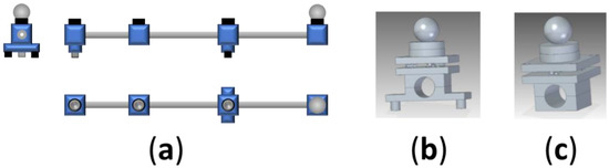 Two design proposals for the artefact structure are evaluated. The first prototype is a single tube structure in which the line of the measurement points is parallel to the bar and is located beyond the structure (Figure 3a). Each flange has been designed to hold the bar and locate the magnetic holder, in one case, and the kinematic support for the magnetic holder, in the rest of the cases, defining each measurement position (Figure 3b,c).