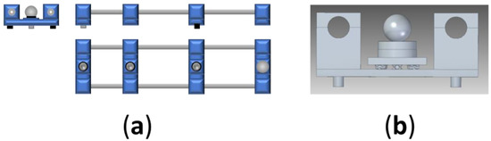 Kinematic support for the mobile sphere. (a) Distribution and orientation of the cylinders; (b) distribution and orientation of the spheres; (c) model of the kinematic support mounted, contact between spheres and cylinders.
