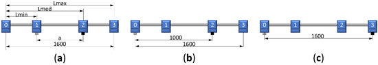 In order to define the position of the standing legs, a finite element analysis of the deformation of the structure has been carried out (twenty-four simulations, twelve for each prototype, were performed). The study analyses four different positions of the supports, and the deformation occurred when the measurement system was placed in the three different measurement positions (Lmin, Lmid, and Lmax). The measurement system will rest in the reference position and in the position under verification (Lmin, Lmid, or Lmax). Therefore, in the analysis there is a load of 1N in the reference position (position of the magnetic holder, point 0, Figure 6) and another load of the same value in the measurement position for each case. The four positions of the supports are the Airy point (a = 923.76 mm), the Bessel points (a = 895.04 mm, Figure 6a), the supports located in the reference position and in the Lmid (Figure 6b), and finally, the supports located in the reference position and in the Lmax (Figure 6c). All the combinations make twenty-four simulations (2 prototypes, 4 supporting leg configuration and 3 load configurations).