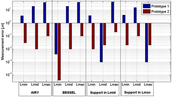 The localization of the spheres beyond the structure line amplifies the measurement error due to the deformation in prototype 1. Based on that, prototype 1 was discarded and the results shown in the paper correspond to prototype 2. The measurement errors in prototype 2 are minimum using the Bessel points and do not exceed from 0.1 µm, value obtained when the system is loaded in Lmax position (points 0 and 3, Figure 6) and lower in the other cases (Lmin and Lmid) (according with the simulation results using finite elements software (Solid Edge ST8, Siemens PLM Software, Plano, TX, USA)).