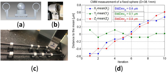 The position of the spheres has been measured with a coordinate measurement machine (CMM) to obtain the uncertainty of the calibration artefact. First, the repeatability of the CMM measuring a sphere with a diameter of 38.1 mm (1½’’) has been estimated in 0.4 µm. The measurement position number 3 (Figure 8b) was measured ten times with the CMM without removing the sphere from the kinematic support (Figure 9d).