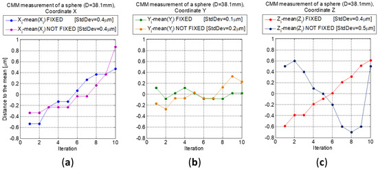 CMM measuring a sphere (Diameter 38.1 mm), distance to the mean of the ten iterations in mm in each coordinate. Standard deviation values of each coordinate (fixed and not fixed) are included in the legend. The results are compared with those obtained measuring a fixed sphere. (a) Distance to the mean of the ten iterations in mm in X coordinate; (b) Distance to the mean of the ten iterations in mm in Y coordinate; (c) Distance to the mean of the ten iterations in mm in Z coordinate.