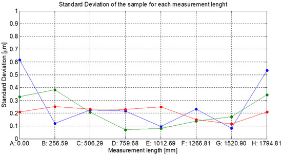 The next step, after measuring the repeatability of the kinematic supports, is to check the effect of the deformation in the measurement length corresponding to each sphere position. To evaluate this effect, the measurement of the reference position (A, number 0 in Figure 8b) and the other positions has been carried out moving the sphere with the kinematic support from B (position number 1 in Figure 8b) to H (position number 7 in Figure 8b). The procedure is repeated ten times. The measurement results allow estimating the repeatability of the measurement length in each position as the standard deviation of ten repetitions in each position (Figure 11).