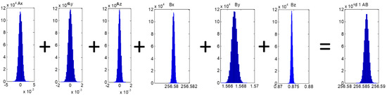 Distribution of the values for each set of coordinates of A and B positions. The distance between this two positions materializes the measurement length number 1 (d1, AB). The distribution of the measurement length can be obtained by simulation with the Monte Carlo method.