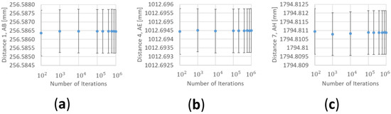 Evolution of the results as the number of iterations increase from 102 to 106. (a) Results for the first measurement length materialized between point A and point B of the calibration artefact; (b) results for the fourth measurement length materialized between point A and point E of the calibration artefact; (c) results for the seventh measurement length materialized between point A and point H of the calibration artefact.