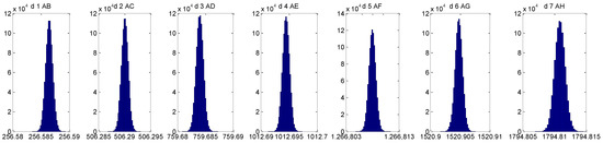 The uncertainty distribution for each measurement length (from distance d1, AB to distance d7, AH).