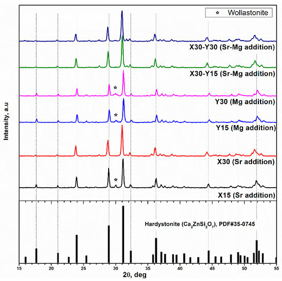 X30Y15 and X30Y30 ceramics, corresponding to the simultaneous inclusion of Sr2+, Mg2+, and B3+ ions in the hardystonite structure, confirmed the reduction of secondary phases found with X30. Strontium ions likely had a ‘triggering’ action. That is, the distortion in the spacing between zinc silicate layers, caused by the larger Sr2+ ions compared to the Ca2+ ions, evidently balanced the distortions in the same layers occurring upon replacement of Zn2+ and Si4+ ions with Mg2+ and B3+ ions.